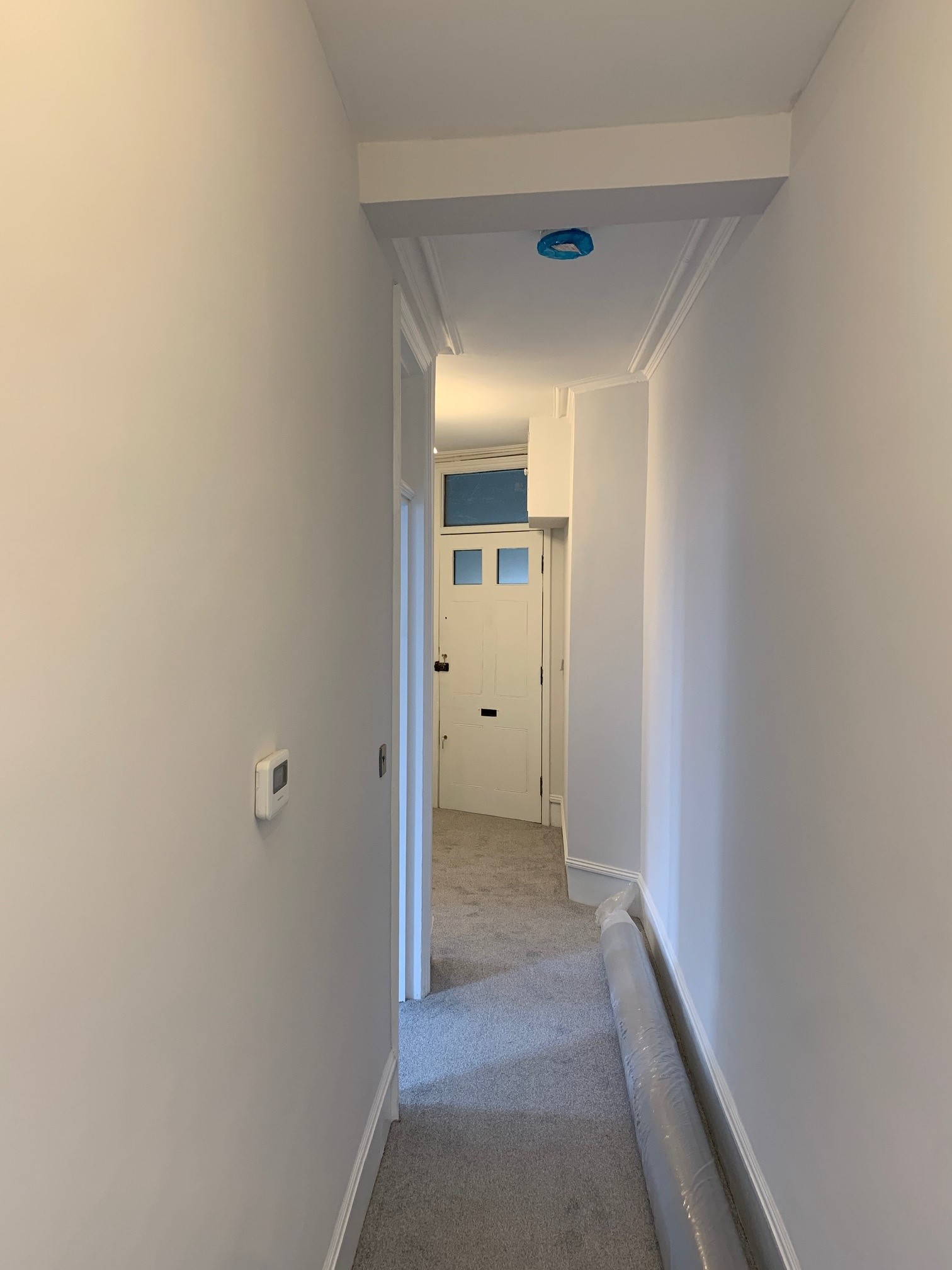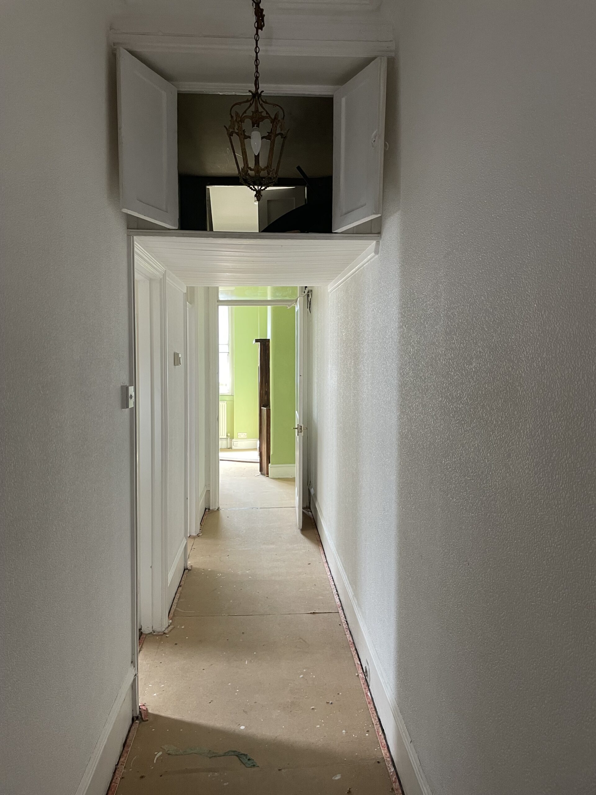 - Strip existing ceiling decorations, replaster and decorate throughout.